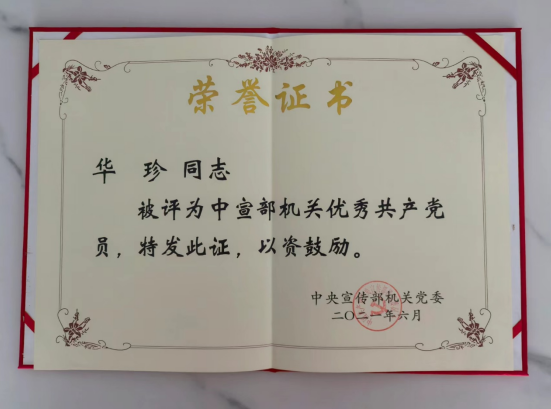2021年6月22日,中宣部机关党委下发《关于表彰中宣部机关优秀共产党员、优秀党务工作者和先进基层党组织的决定》,中国出版协会党总支机关党支部华珍同志被评为中宣部机关优秀共产党员。