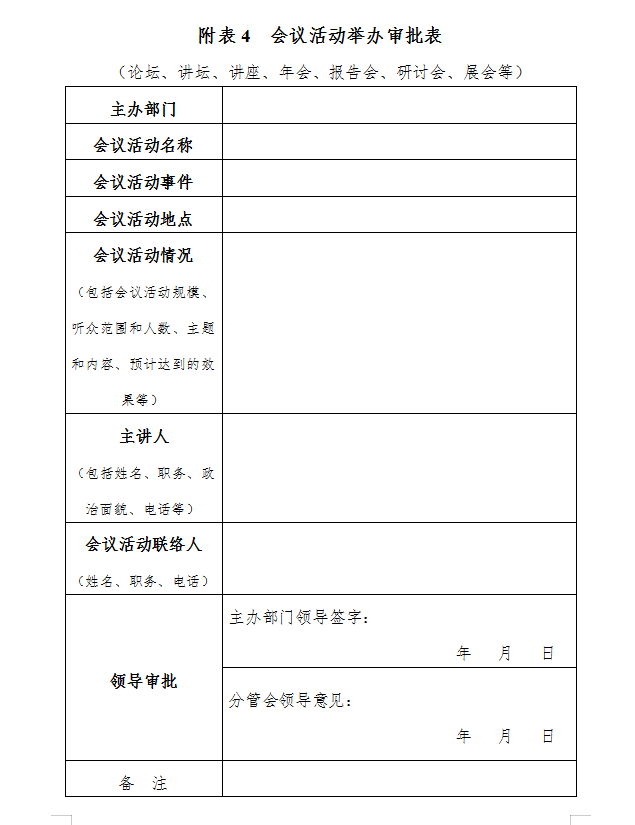 第二十四条 建立“一会一报”机制。各部门、各分会、各单位组织会议活动,由所在部门、单位、分会负责人和分管领导进行审查和备案,并填写《举办会议活动审批表》,报相关领导审批(见附表4)。影响重大的,须报本会主要负责人审批。同时,主办部门、单位、分会要对会议活动所有发言人的发言稿或PPT进行内容审核,严格执行发言内容三审制度(见附表5),坚决避免出现意识形态问题。在审核内容之时,要注意使用好智能辅助审校软件,运用先进技术手段排除各类意识形态问题隐患。